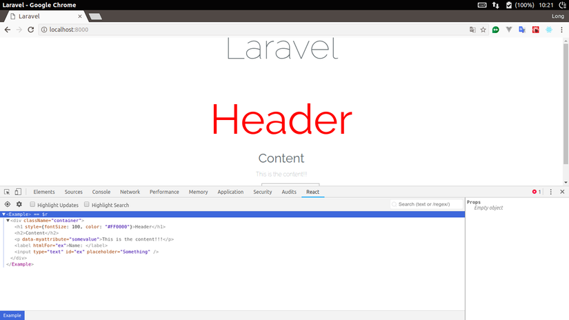 <div>.import React, { Component } from 'react'; import ReactDOM from 'react-dom'; export default class Example extends Component { render() { return ( <div> <h1>Header</h1> <h2>Content</h2> <p>This is the content!!!</p> </div> ); } } if (document.getElementById('example')) { ReactDOM.render(<Example />, document.getElementById('example')); }Kết quả: