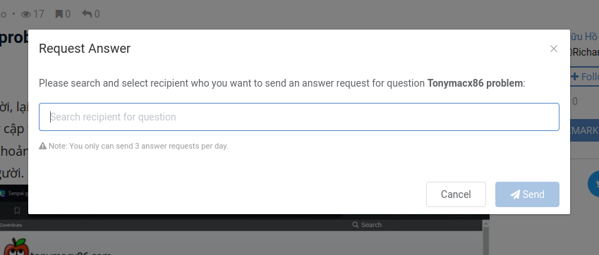Đây là 1 tính năng rất hữu ích, khi bạn đang cần câu trả lời cho 1 câu hỏi nào đó mà bạn biết là một user đích danh trên Viblo chắc chắn có thể giải đáp giúp bạn. Tuy nhiên, bạn cũng đừng lạm dụng tính năng này quá nhé, một ngày bạn chỉ có thể gửi tối đa 3 yêu cầu nhờ trả lời câu hỏi để tránh làm phiền user khác.