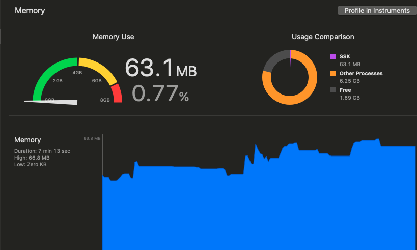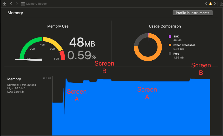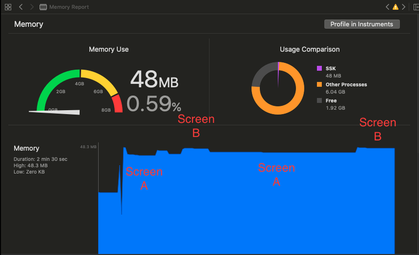 Cách dễ nhất để quan sát điều đó là bằng cách sử dụng Instruments trên iOS hoặc Android Studio Profiler cho Android. Cả hai công cụ này đều hiển thị tổng mức sử dụng bộ nhớ của ứng dụng - bao gồm cả bộ nhớ được cấp phát bởi JS, cũng như bộ nhớ được phân bổ bởi modules và views. Hãy cùng xem cách sử dụng chúng: