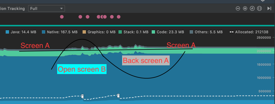 Sử dụng ứng dụng của bạn trong một thời gian và xem cách sử dụng bộ nhớ, việc tracking thông qua debug navigator không hẳn đã chính xác nhưng cũng là một thông tin để chúng ta tham khảo màn hình đó có khả năng đang bị memory leak. Tham khảo hình ở ví dụ trên, thực hiện open screen B từ screen A, tại screen B thực hiện call api đổ dữ liệu vào một Flatlist. Trực quan ta có thể thế memory khi vào screen B đều tăng lên do có thực hiện thay đổi bộ nhớ, memory sẽ giảm đi khi back lại màn hình A nếu ở đây không có hiện tượng memory leak, cứ như vậy tăng rồi lại giảm. Từ đó ta có thể đoán định màn hình này không có khả năng bị memory leak