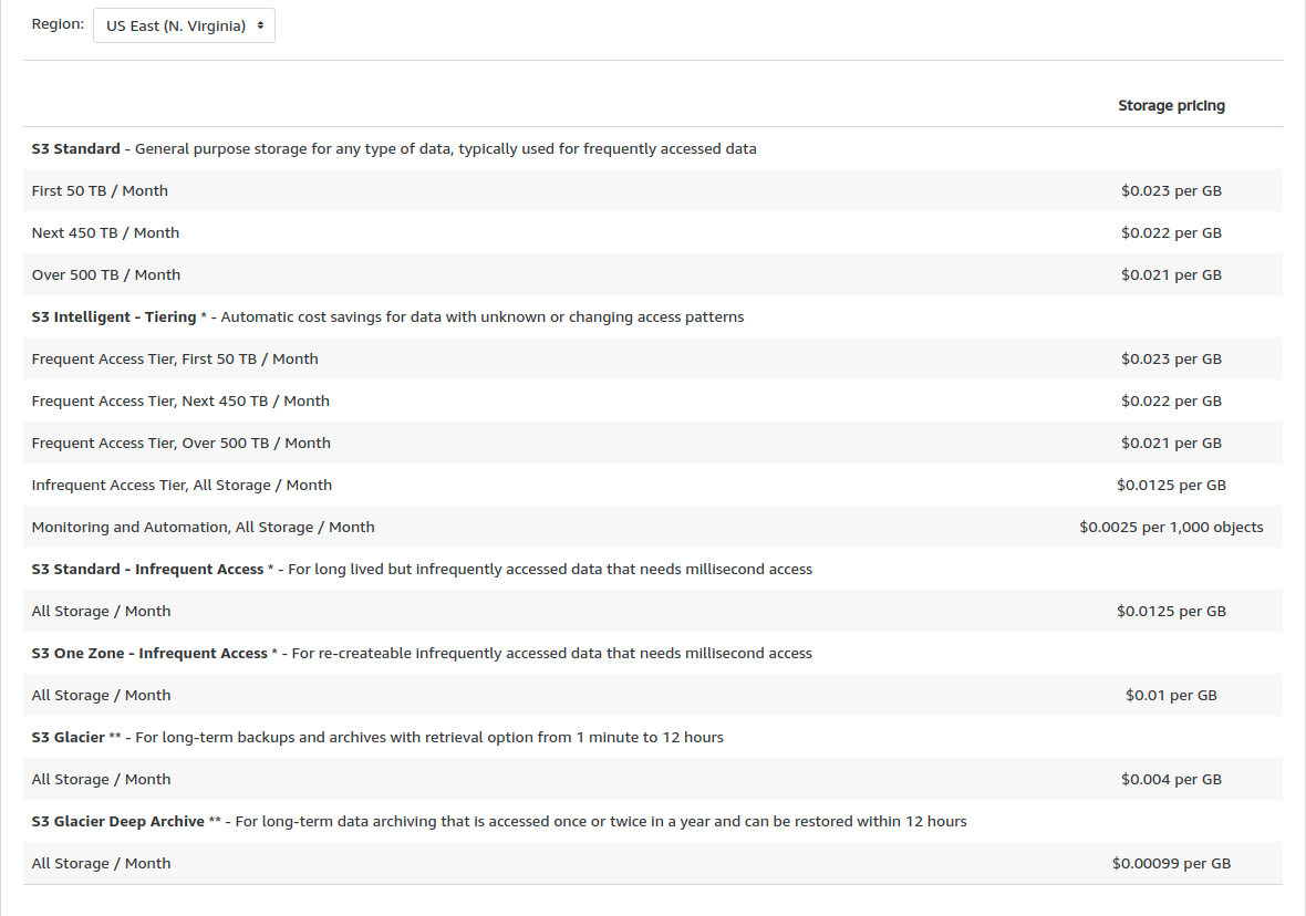 2 lớp cuối cùng trong bảng là S3 Glacier và S3 Glacier Deep Archive . Chúng có giá mỗi GB thấp nhất. Nhưng chi phí truy cập cao. Do đó chúng được sử dụng cho mục đích lưu trữ.