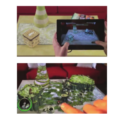 Một chất lượng quan trọng của các trò chơi truyền thống là bản chất hữu hình của chúng. Trẻ em có thể biến toàn bộ căn phòng của mình thành một sân chơi, với những mảnh đồ nội thất được chuyển đổi thành một cảnh quan hỗ trợ các hoạt động thể chất như nhảy và trốn. Ngược lại, các trò chơi video thường được coi là một lĩnh vực hoàn toàn ảo. AR có thể mang các trò chơi kỹ thuật số cùng với môi trường thực tế. Ví dụ, Vuforia SmartTerrain (Hình dưới) cung cấp bản quét 3D của một cảnh thực và biến nó thành một sân chơi cho một trò chơi phòng thủ.
