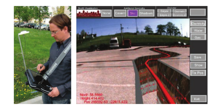 Máy tính bảng có hệ thống GPS vi sai cho AR ngoài trời (trái). Chế độ xem đăng ký địa lý của một cuộc khai quật ảo cho thấy một ống dẫn khí (phải).