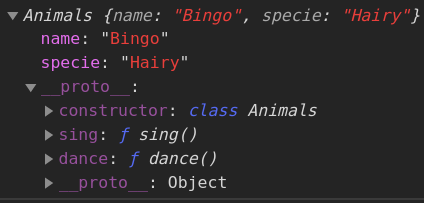 __proto__ sẽ tham chiếu đến prototype của Animals . Từ đó , chúng ta có thể thấy hàm khởi tạo và các hàm chức năng chính nằm gọn trong __proto__ (contructor(), sing(), dance()).