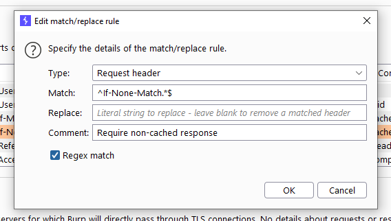 Nếu các bạn hay gặp cái mã code 304 này, thì tức là nội dung nó đã được cache trong trình duyệt, mà bạn lại muốn xem nội dung của response này thì phải xoá cái dòng If-None-Match kia đi rồi gửi request lại thì sẽ đọc được response. Tuy nhiên ở trong BurpSuite có chế độ Match and Replace, mình sẽ cài đặt cho lúc nào trong request cũng xoá cái dòng If-None-Match đi nhé.