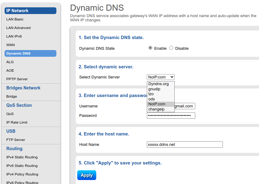 Tuy nhiên, do việc sử dụng mạng nhà, còn gọi là được mạng gia đình để cài đặt WireGuard Server, mà mạng gia đình thì mình không bỏ tiền ra để mua IP tĩnh vì nó lãng phí :v, nên mình sử dụng Dynamic DNS. Các bạn có thể sử dụng một vài dịch vụ như hình bên dưới (hình mình chụp tính năng Dynamic DNS trên modem của FPT). Do mạng gia đình là mạng IP động, cứ thi thoảng mạng nhà nó lại đổi IP sang một địa chỉ khác, vậy để lúc nào cũng truy cập đúng cái IP mạng nhà mình thì sử dụng Dynamic DNS sẽ giúp cho bạn lúc nào cũng truy cập được mạng nhà mình từ xa
