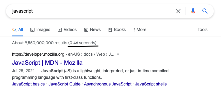 Trong JS, cũng có thể nhận được thời gian thực thi code giống như google: