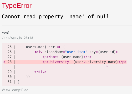 Trên thực tế thì các dạng dữ liệu như mình nói trên thường được lấy về từ server API của chúng ta hoặc một server nào đó và sử dụng như trên. Tuy nhiên chẳn may có một ngày, một user nào đó không có thông tin về university hay chính xác là university = null điều đó sẽ dẫn tới kết quả như sau khi chúng ta render UI: