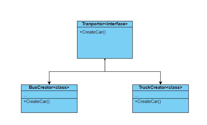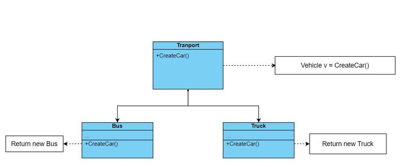 Trong đó base class Transportor triển khai interface ICar và có một factory method CreateCar