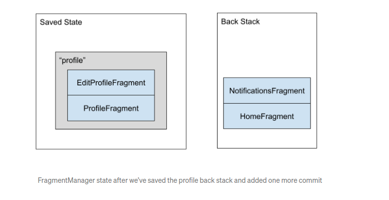Với nhiều issue đã được fix(và một FragmentManager đáng tin cậy và dễ hiểu hơn nhiều), mẹo của các API của saveBackStack () và restoreBackStack () đã được thêm vào.