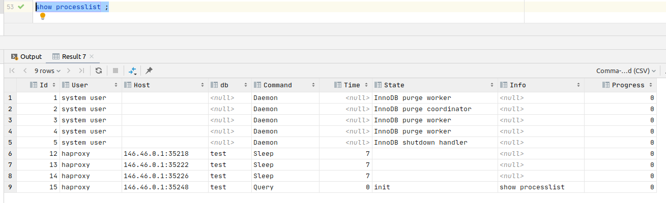Chạy lệnh này để kiểm tra cơ sở dữ liệu đang có các connection đến từ đâu (Host), từ user nào (User), database nào (db). Xem chi tiết tại đây Kết quả như bên dưới.