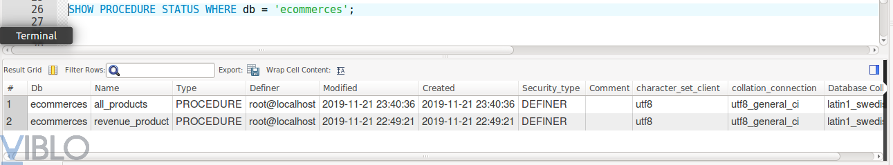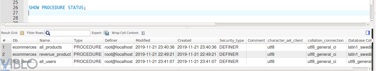 - SHOW PROCEDURE STATUS : Sẽ trả về danh sách các stored procedures tồn tại với đầy đủ thông tin phản ánh các đặc tính của SP