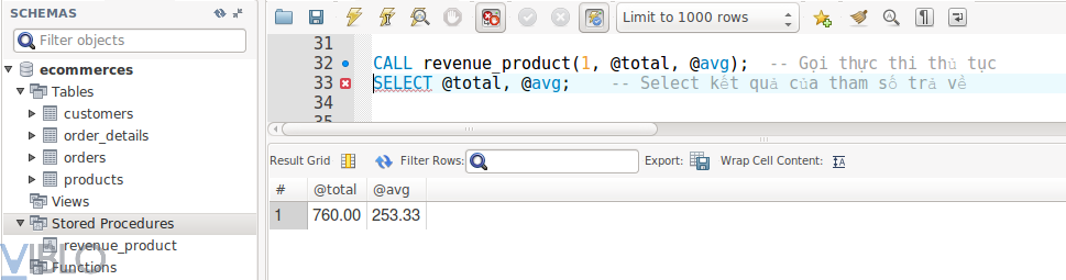 SELECT @total, @avg; -- Select kết quả của tham số trả về