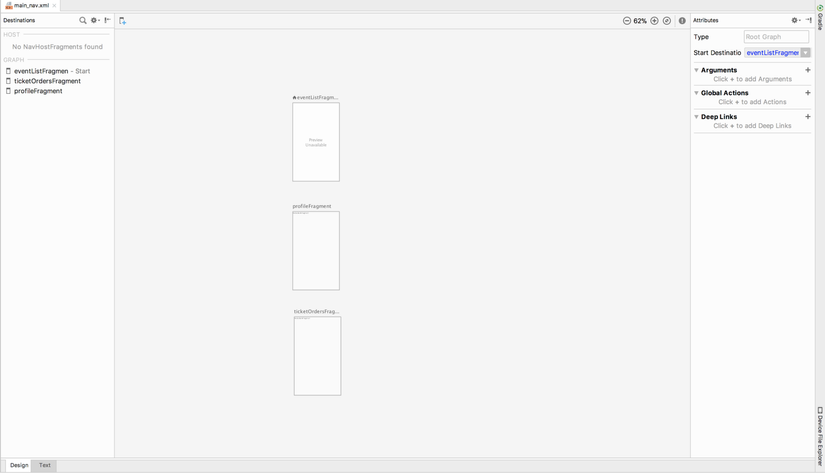 Như bạn có thể thấy chúng ta có 3 destination, đó là các điểm vào ứng dụng. Các destination này không được kết nối với nhau và do đó sẽ không có action nào liên kết chúng với nhau.