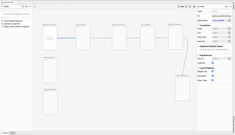Phần này hiển thị danh sách tất cả các destinations trong graph và đâu là nơi navigation graph được lưu trữ. Phần giữa và phần lớn là nơi bạn có thể thấy một đại diện trực quan của tất cả các destinations trong graph và các kết nối của chúng. Nếu bạn đang sử dụng namespace trong layouts của mình, data cũng sẽ được hiển thị ở đây và bạn có thể có view tốt về ứng dụng và data mẫu của mình. Phần thứ ba và ngoài cùng bên phải là phần attributes. Nội dung phần này chỉ hiển thị nếu bạn chọn một destination hoặc action. Phần này sẽ hiển thị và cho phép sửa đổi các thuộc tính của destination hoặc action đã chọn.