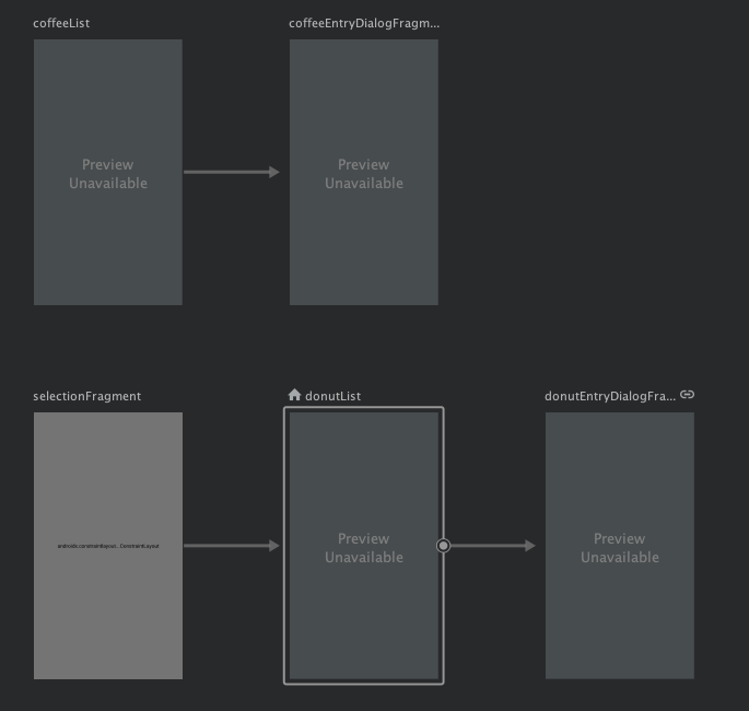 Với những sự thay đổi này là việc update Navigation graph với những destinations mới và các actions từ coffeFragment tới coffeeDialogFragment, tương tự với selectionFragment tới donutFragment. Tiếp theo chúng ta sẽ kết hợp mọi thứ lại với nhau và điều hướng tới SelectionFragment
