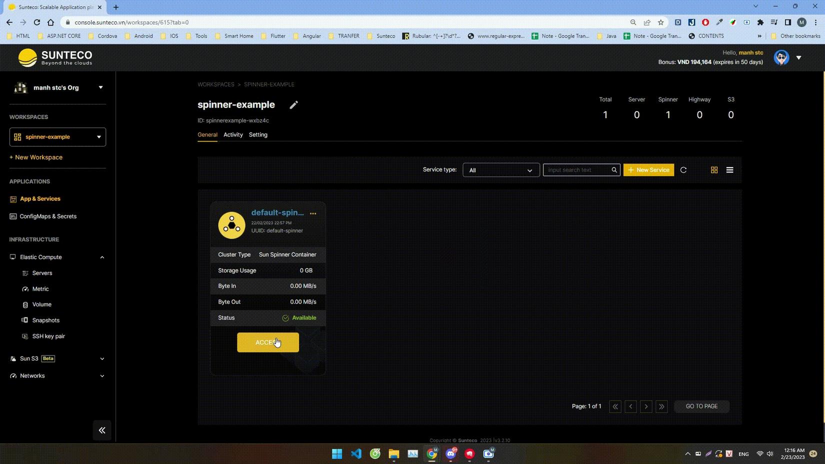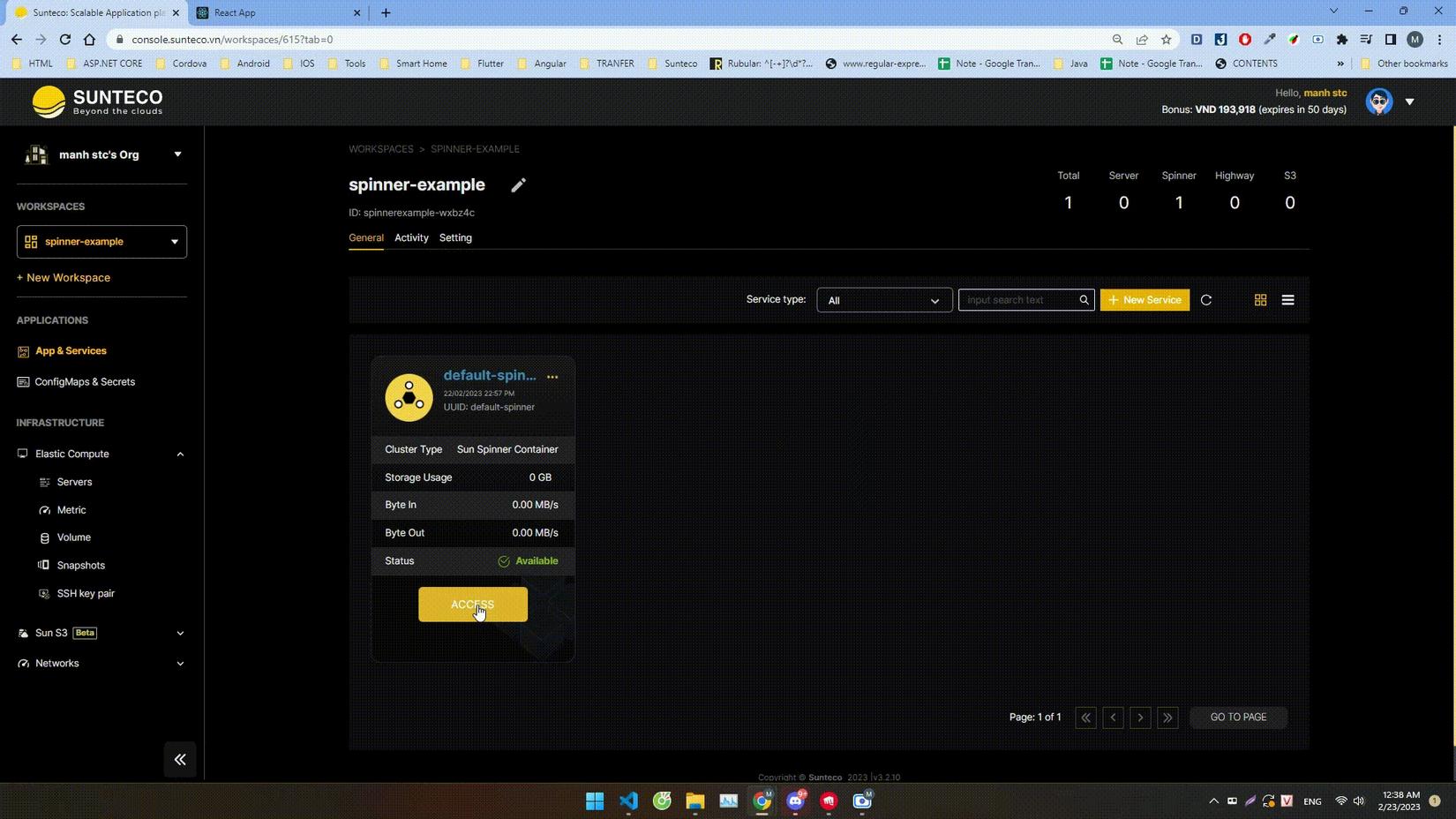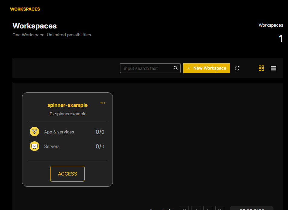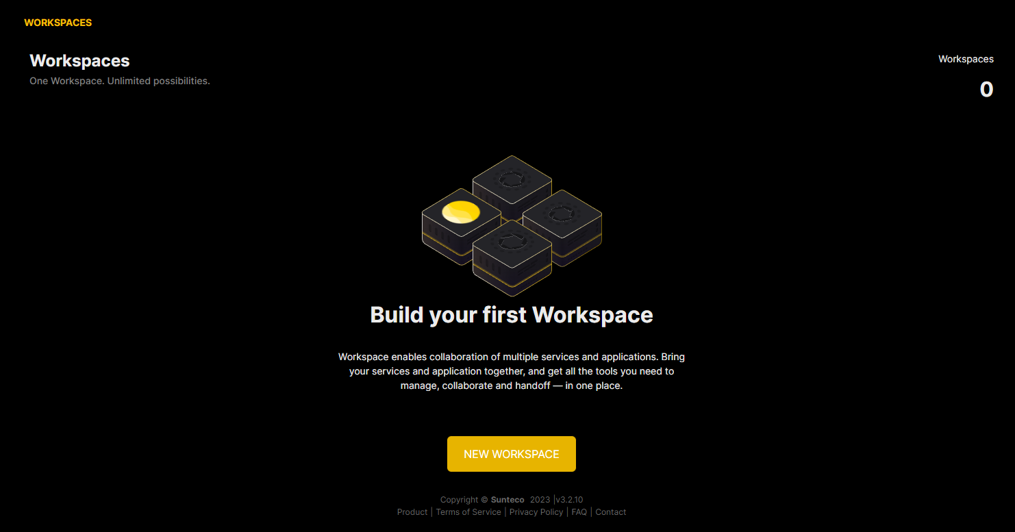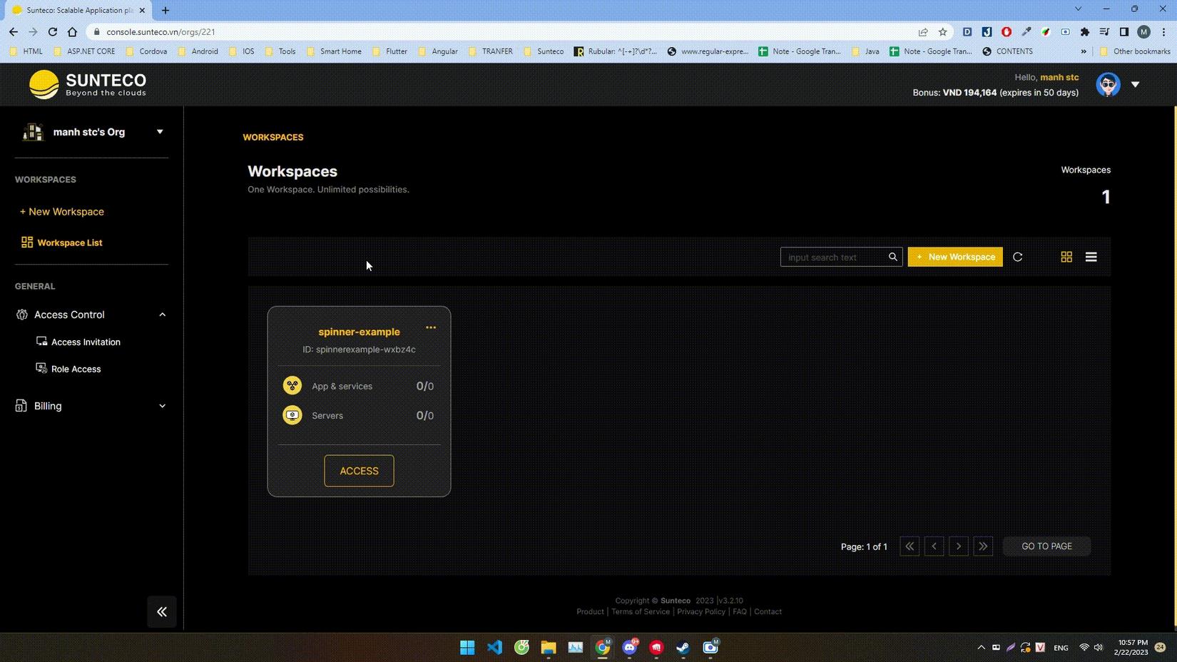 Sau khi đăng nhập vào hệ thống Sunteco Cloud, chúng ta sẽ tạo mới 1 Workspace tên "spinner-example":