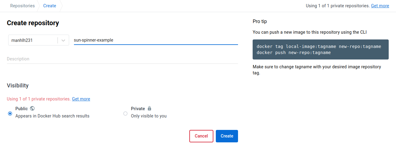 Trước tiên mình sẽ tạo 1 repository trên Docker hub tên là:”sun-spinner-example”