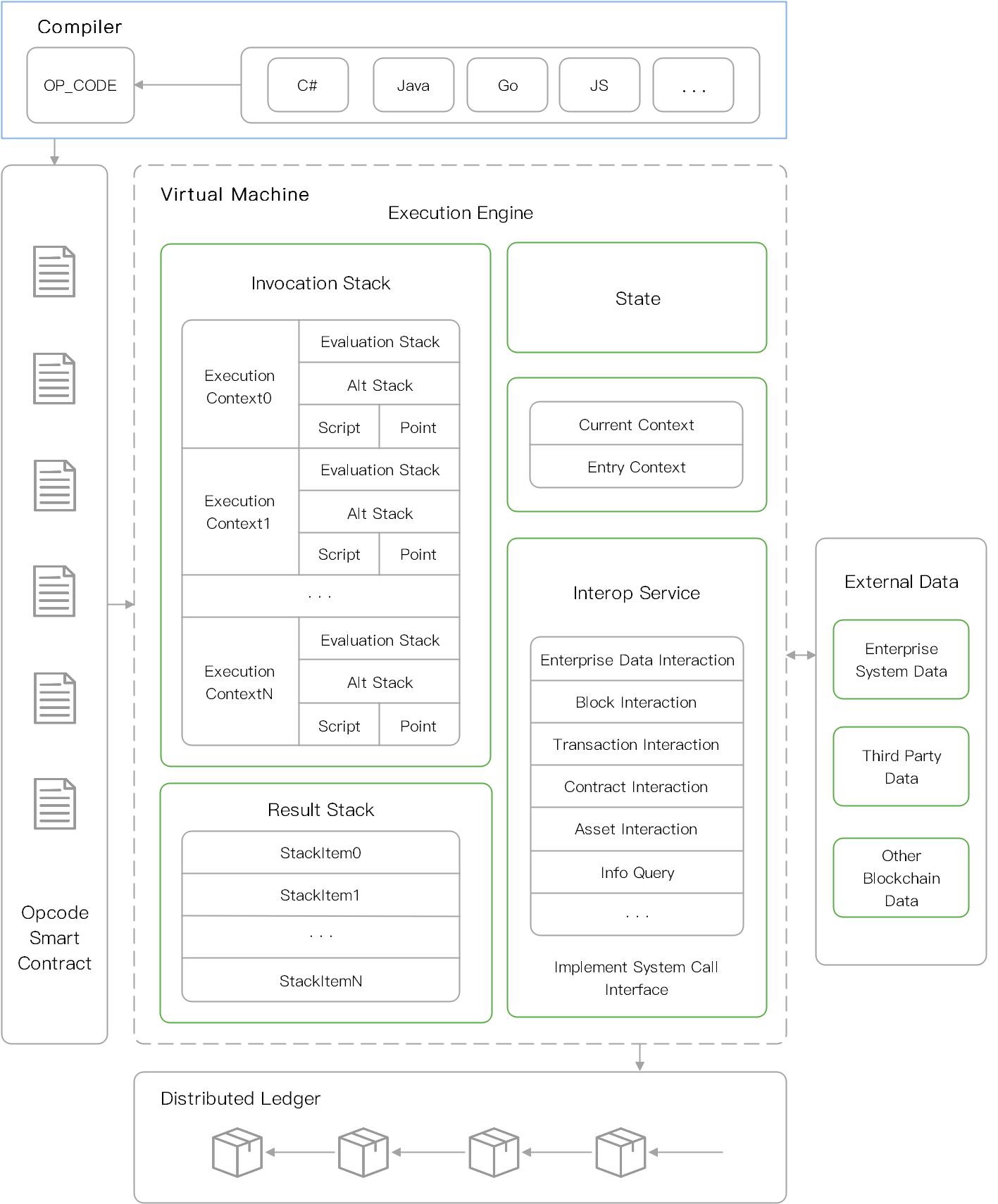 - Interoperation Service Layer: là cầu nối giữa VM và dữ liệu ngoài. Bằng cách gọi các interoperation interfaces, NeoVM có thể truy cập thông tin block, thông tin transaction, thông tin contract, thông tin asset và các dữ liệu khác cần thiết để thực hiện smart contract.