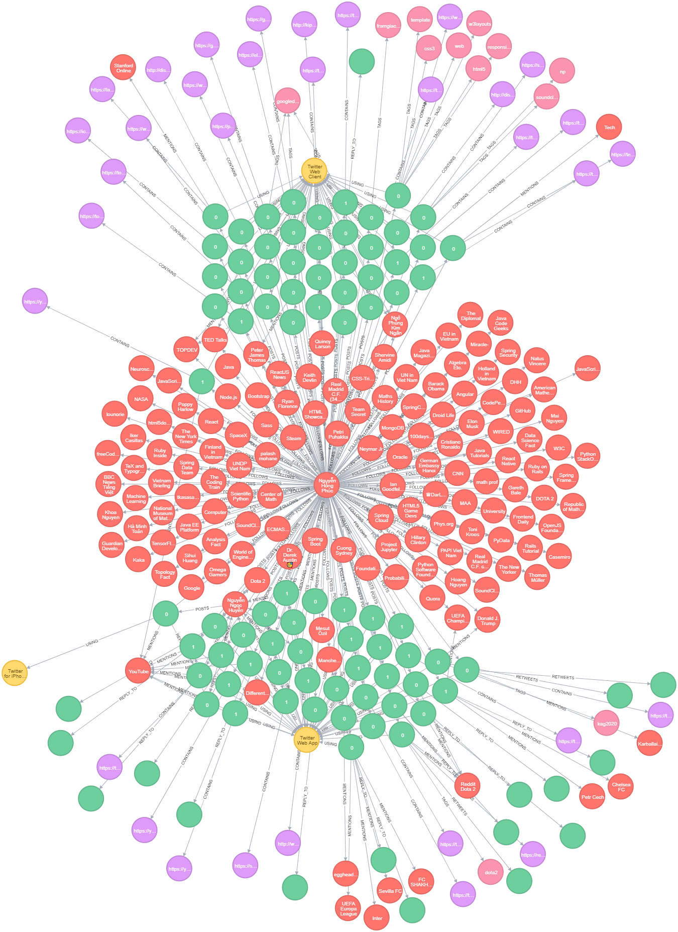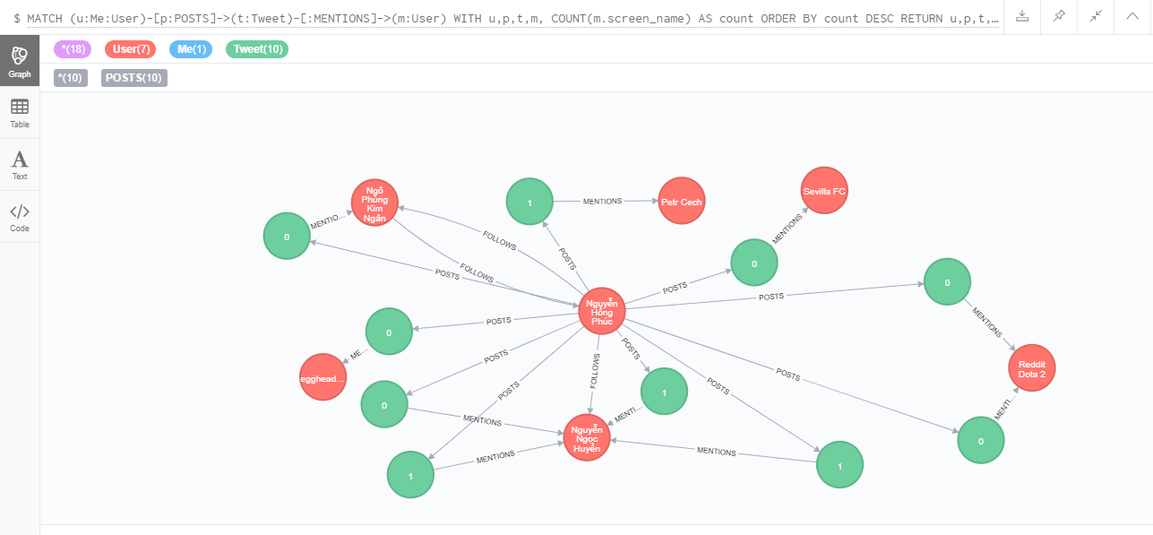 Tổng kết lại nhờ Neo4j thì mình biết được sau gần 2 năm dùng Twitter thì mình đã follows 148 users, Post Tweets: 96 lần, Post Tweets kèm links: 33 lần, Post Tweets kèm hashtags: 12 lần, Post Tweets sử dụng source: 3 lần. được retweet: 3 lần.