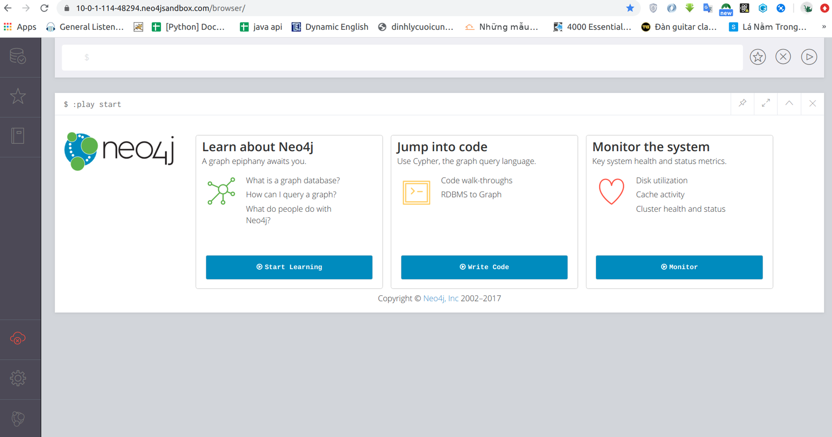 Mình sẽ truy cập con Neo4j sử dụng url, username và password mà họ cung cấp cho mình, con instance mà họ tạo cho mình chỉ tồn tại được trong vài ngày mà thôi, hình phía dưới là giao diện của Neo4j