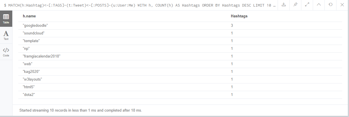 RETURN h.name, Hashtags