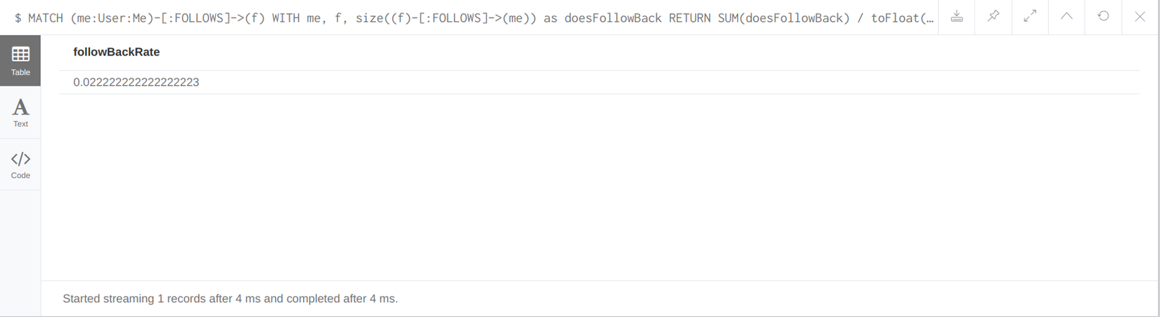 RETURN SUM(doesFollowBack) / toFloat(COUNT(f)) AS followBackRate