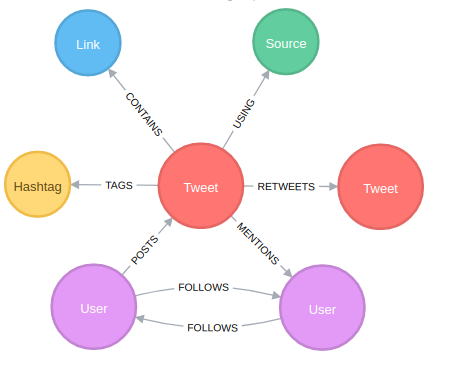 Các hình tròn sẽ biểu diễn cho các Nodes, các hình mũi tên sẽ biểu diễn cho các Relationships giữa các nodes với nhau. Mình sẽ loading data Tweets từ Twitter API và sau đó bắt đầu truy vấn data....