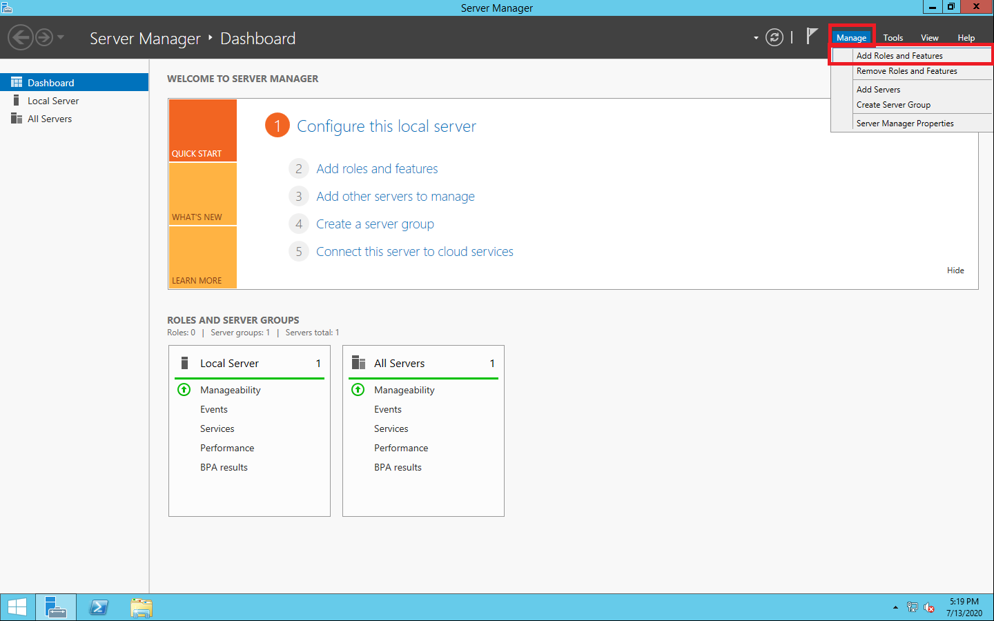 Đầu tiên vào menu Server Manager sau đó chọn Manage=>Add Roles and Features như hình bên dưới.