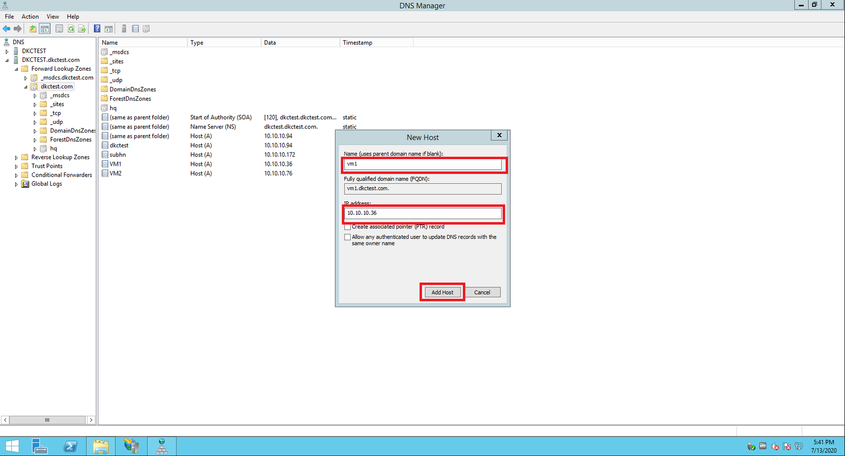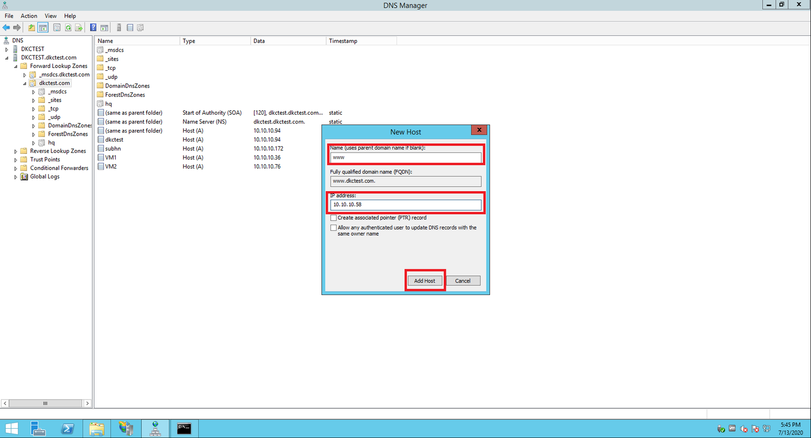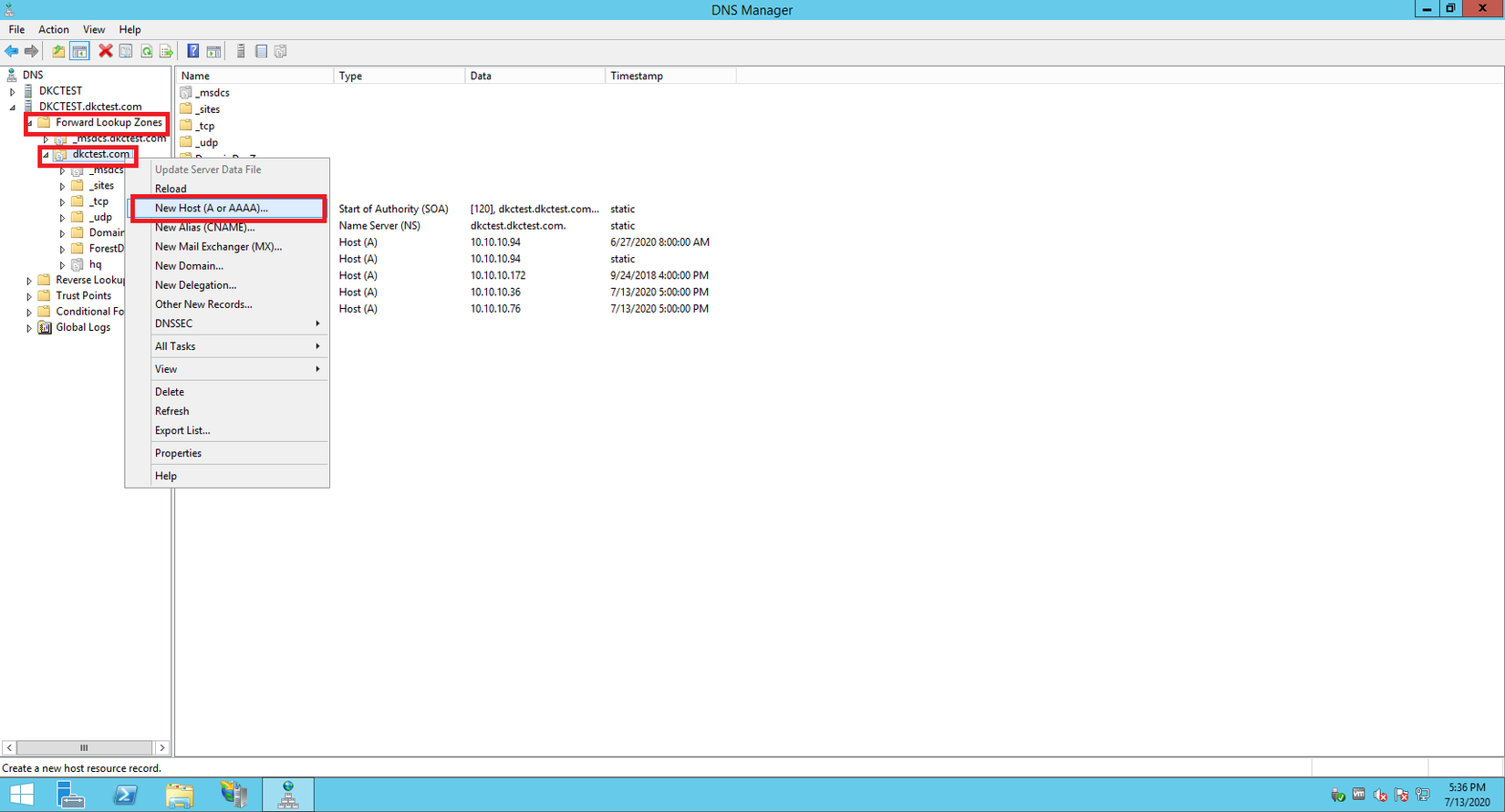 Trên máy sử dụng làm AD mở DNS Manager => Chọn DSN(DKCTEST.COM) => Forward lookup Zones