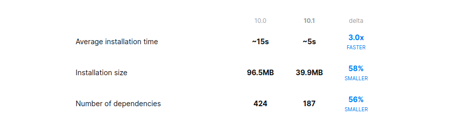 Chúng tôi đã tối ưu hóa dependency graph của Next.js để giảm thời gian cài đặt và dependency size. Giờ đây, việc tạo một dự án Next.js cả locally và trong quá trình CI/CD của bạn nhanh hơn bao giờ hết.