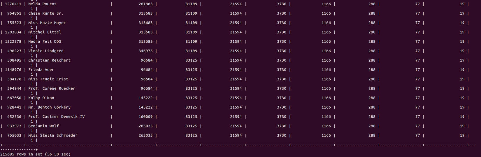 Như ở phần trên ta đã đề cập đến, có công cụ mới là recursive query trong tay, ta hãy thử tự hỏi, liệu chúng ta có thể trực tiếp tạo dữ liệu trong database hay không. Bỏ qua trường name, vì ta có thể nhận định, việc tạo chuỗi kí tự có nghĩa trong MySQL nghe khá là vọng tưởng, còn nếu chỉ generate một chuỗi random thì cũng không có ý nghĩa, tạm bỏ qua. Ở đây coi như ta chỉ cần tạo ra id cho các user thôi, điều kiện còn lại thì vẫn như cũ. Có tất cả 10 level phụ thuộc, mỗi level sẽ có số lượng user bằng 4 lũy thừa số level, 1 user có thể không có hoặc có nhiều user cấp dưới, nhưng có 1 và chỉ 1 cấp trên.