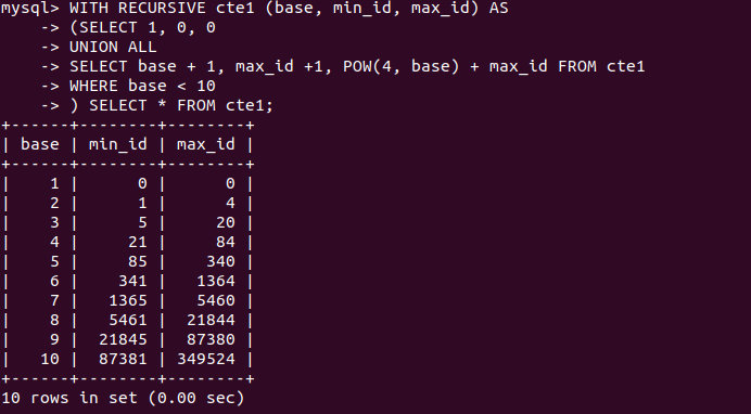 WITH RECURSIVE cte1 (base, min_id, max_id) AS