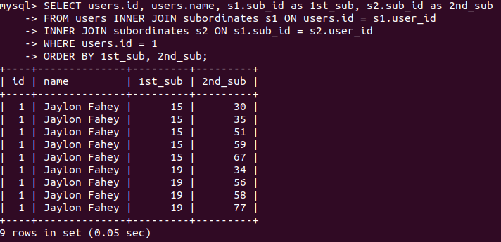Nhìn qua thì có vẻ như, bảng subordinates của chúng ta xuất hiện vài lần trong câu query, tốt nhất là đặt cho nó cái tên để tránh gặp lỗi Ambiguous . Và chỉ lấy ra mỗi thông tin id thôi, cũng chả có gì khác nữa, cứ SELECT tất đi. Câu query của chúng ta ghép lại sẽ thành :