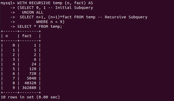 SELECT n+1, (n+1)*fact FROM temp -- Recursive Subquery