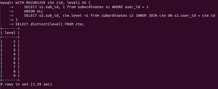SELECT s2.sub_id, cte.level +1 from subordinates s2 INNER JOIN cte ON s2.user_id = cte.id