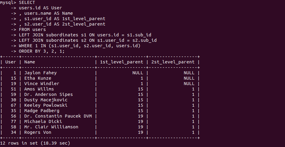 Khá là tuyệt vời. Lấy ra cả thông tin tên tuổi nữa đi cho máu. Thật ra đây là một điều mà mình đã muốn làm từ bài viết trước, lấy ra cả id và tên của user phụ thuộc. Nhưng với cách làm cũ thì ở mỗi tầng lại phải join thêm với bảng users để lấy ra tên, nó loằng ngoằng 1 cách đáng sợ. Đây có vẻ đang ngon, đem ra thử làm xem sao