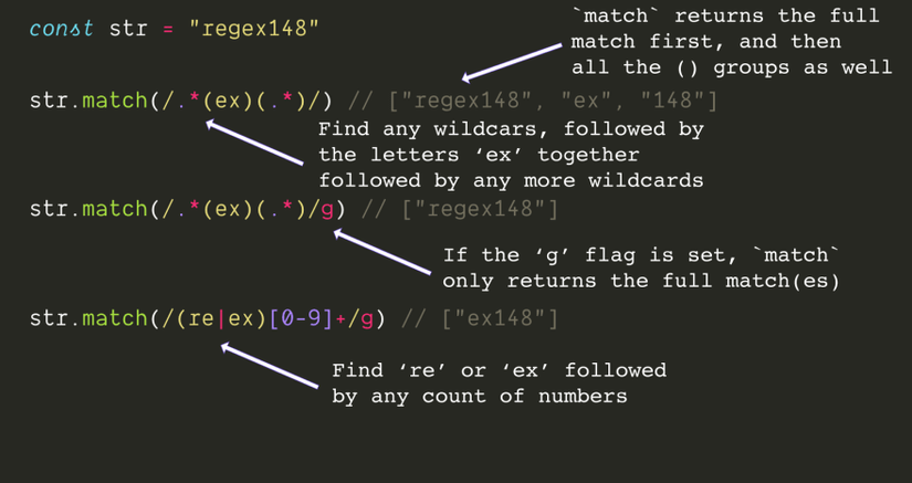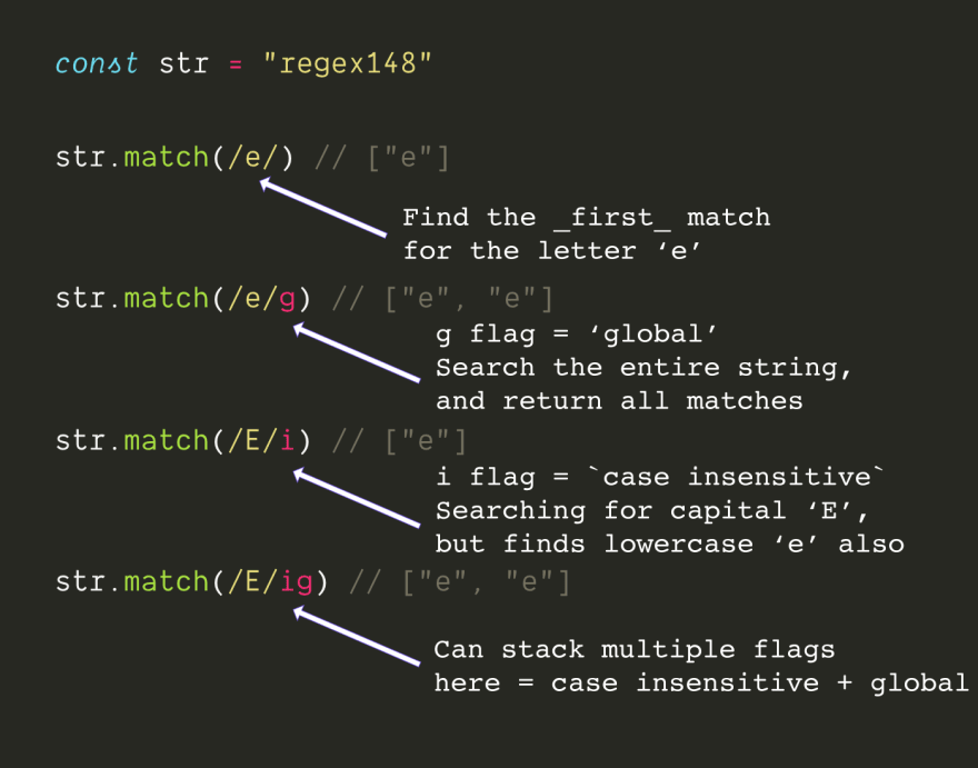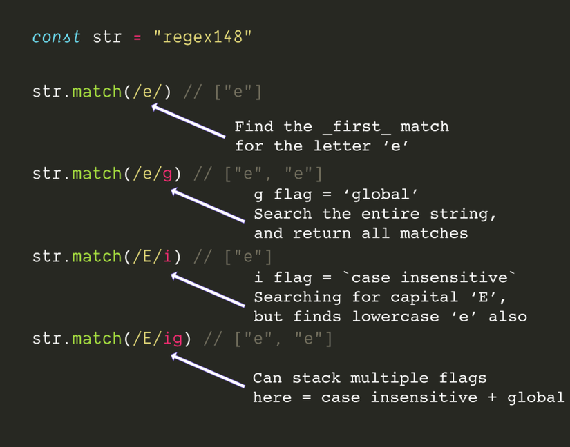 i (insensitive): không phân biệt chữ hoa, chữ thường.m (multi line): khi có ^ và $ thì ^ sẽ là bắt đầu 1 dòng và $ là kết thúc 1 dòng trong chuỗi, nếu không có flag m thì ^ và $ là bắt đầu và kết thúc của cả chuỗi.g (global): tìm tất cả các đoạn ký tự khớp với mẫu tìm kiếm, nếu không có flag g thì việc tìm kiếm sẽ dừng lại ở lần khớp đầu tiên.