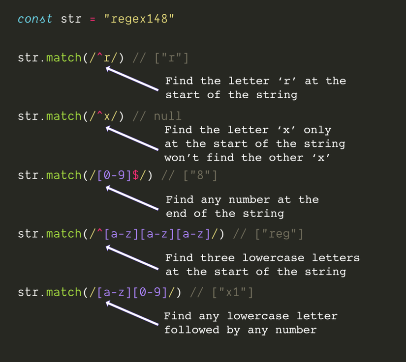 ^Trùng khớp với phần đầu của chuỗi đích. Ví dụ:^asẽ trùng khớp với chữ a trong chuỗiabc. -