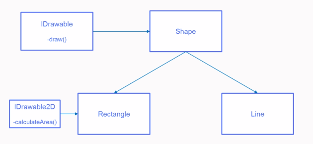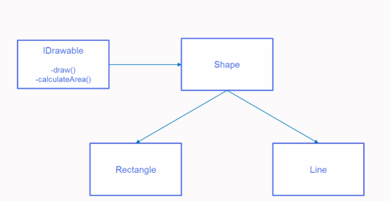 Trong hình bạn có thể thấy chúng ta có class cha là Shape và 2 class con gồm Retangle và Line. Class Shape được kế thừa từ Interface IDrawable. Interface này có 2 phương thức là draw và calculateArea dùng cho vẽ hình và tính toán diện tích. Điều đó có nghĩa là tất cả các class con cũng sẽ phải có 2 phương thức này.