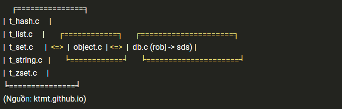 Trang web ktmt.github.io đưa ra loạt bài phân tích về source code Redis (viết bằng C), trong đó có 1 phần về kiểu dữ liệu của Redis. Tham khảo các bài viết đó, chúng ta có thể thấy Redis sử dụng 1 layer mô tả dữ liệu ở mức độ abstract, là redisObjectr-robj (định nghĩa trong redis.h), các thao tác cơ bản của db (db.c) đều làm việc trực tiếp với robj và không cần biết đến sự tồn tại của các kiểu string, list, hash, set, zset. Sơ đồ tổ chức có thể tham khảo trong mô hình dưới đây.