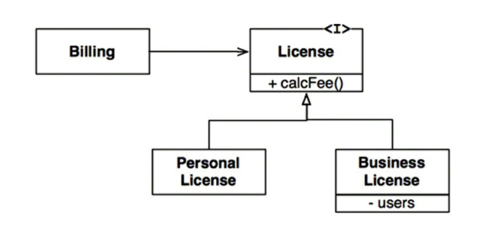 Giả sử chúng ta có một class tên là License như hình dưới đây. Class này có một method tên là calcFee(), mà được gọi bởi ứng dụng Billing. Chúng ta có 2 subtype của License: PersonalLicense và BusinessLicense. Các class này sử dụng các thuật toán khác nhau để tính phí license (kiểu phí bản quyền/giấy phép cho bạn nào không biết license là cái gì).