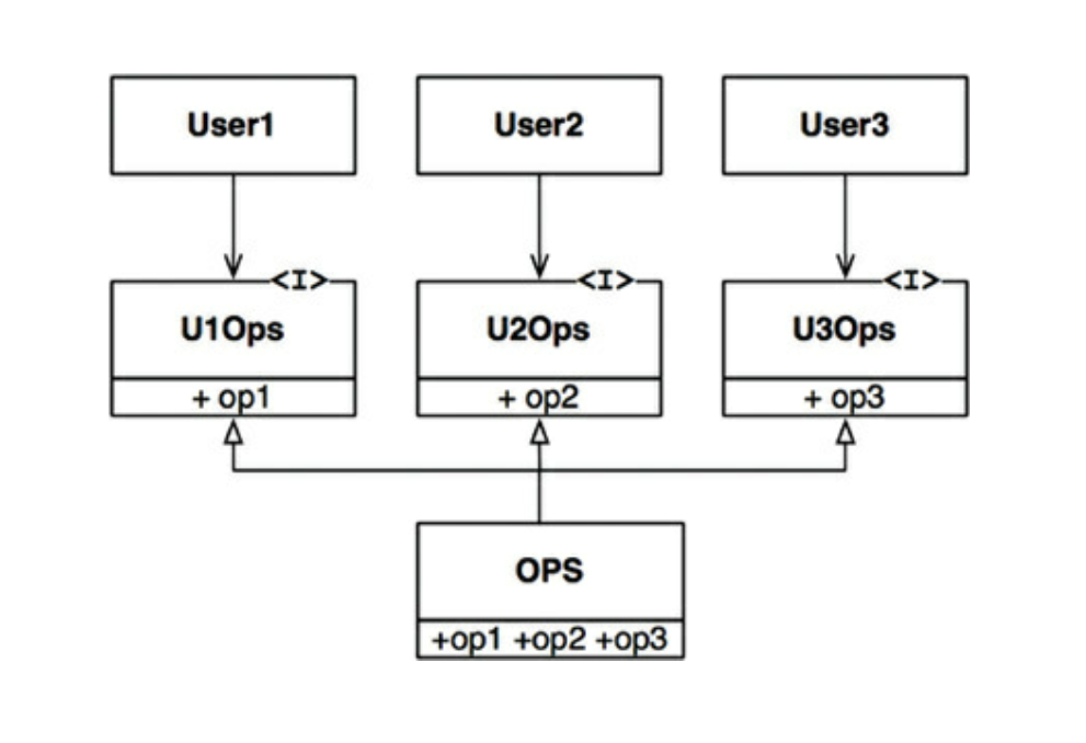 Giờ nếu như mà OPS là một class được viết bằng Java. Rõ ràng mà nói, trong trường hợp đó, source code của User1 sẽ vô tình phụ thuộc vào op2 và op3, mặc dù thậm chí còn chẳng call đến. Tại sao lại phụ thuộc thì về cơ bản là khi có một thay đổi trong source code của op2 trong OPS sẽ khiến User1 phải compile và deploy lại, mặc dù nó chẳng phải quan tâm tí nào đến sự thay đổi đó.