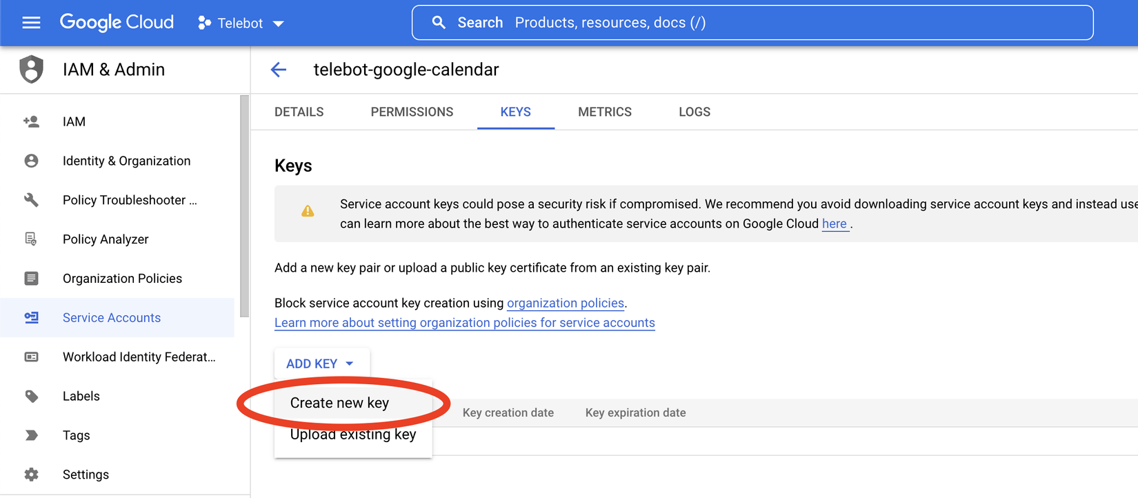 Tại tab KEYS chọn ADD KEY > Create new key.