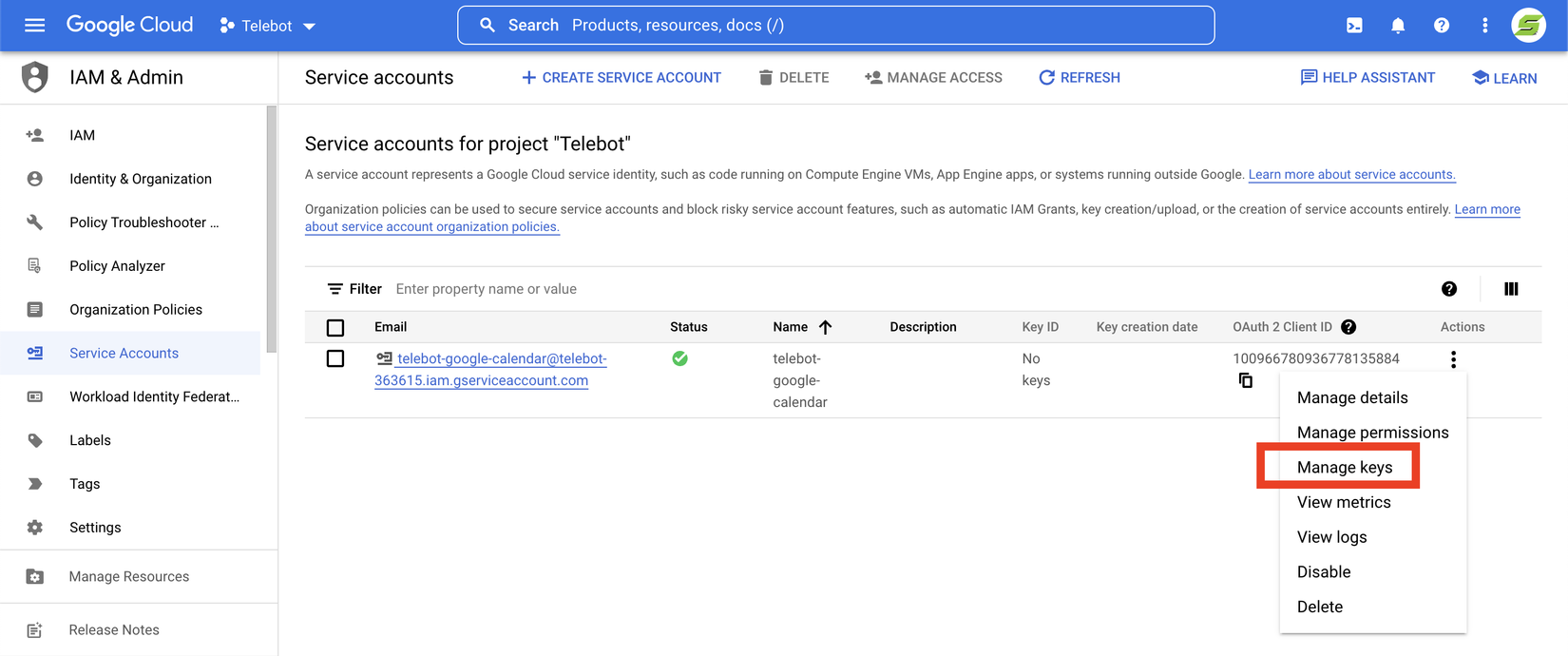 Tiếp theo chọn Manage keys.