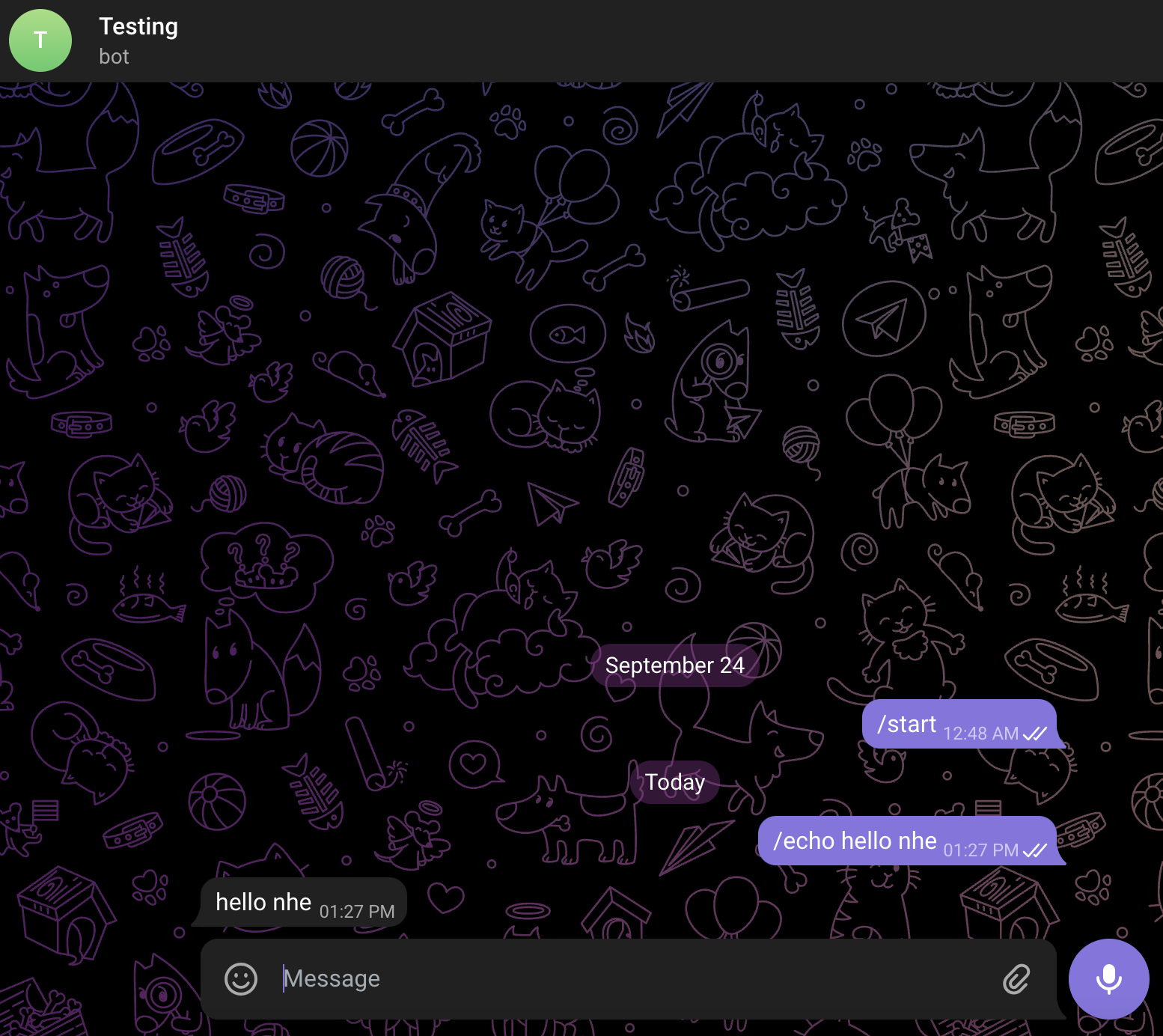 Ok vậy là bé BOT đã nhận được tin nhắn và phản hồi lại câu lệnh mà chúng ta gõ.