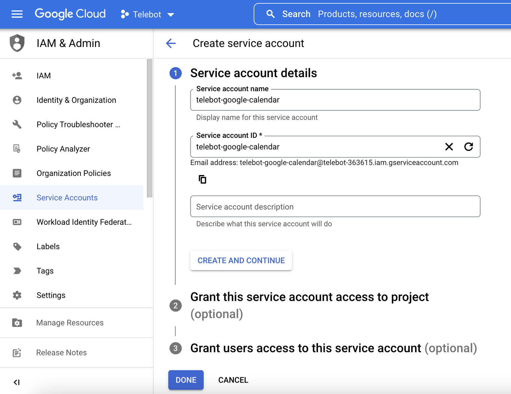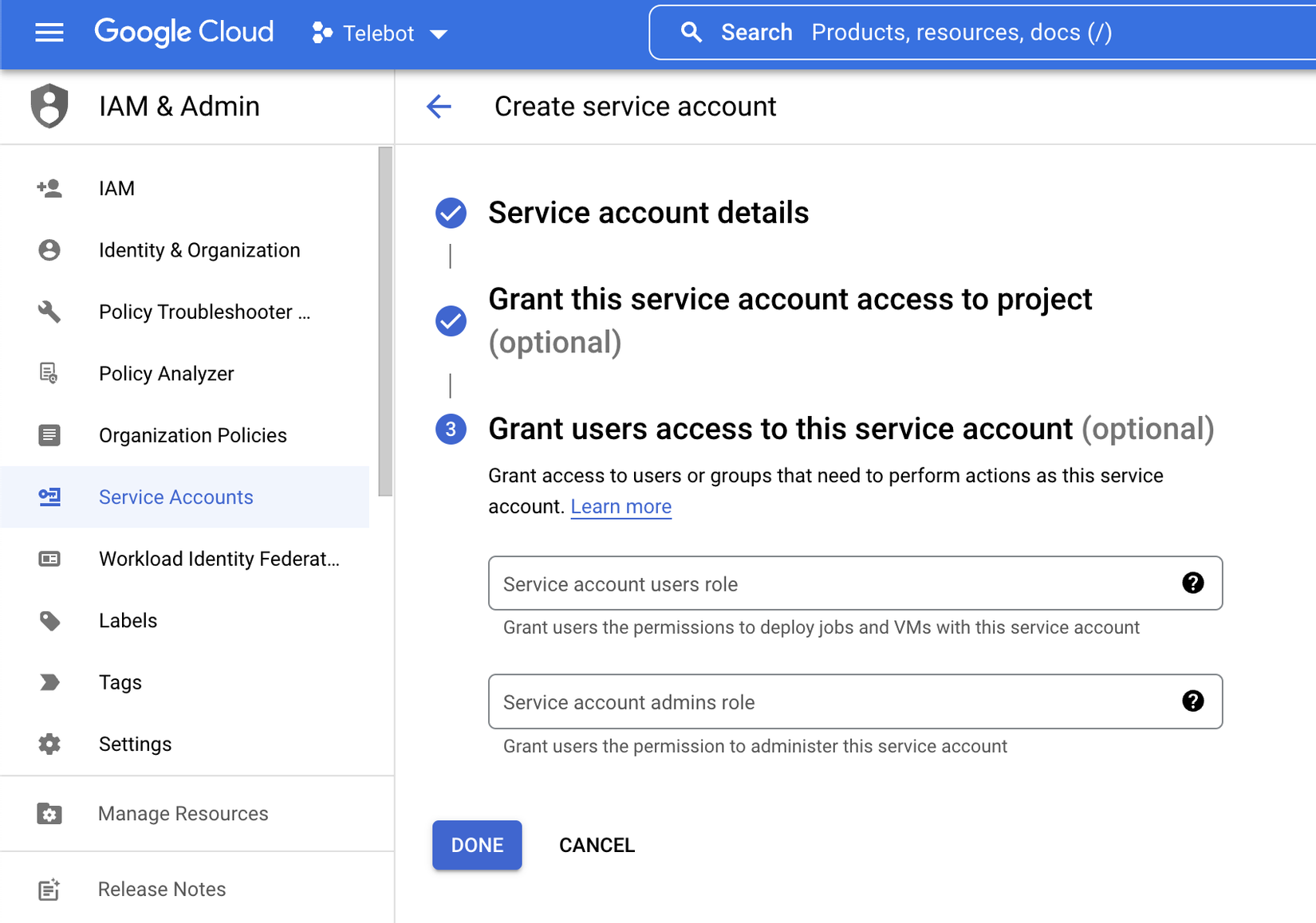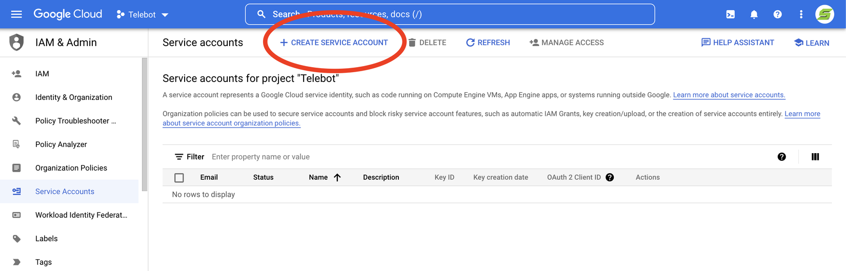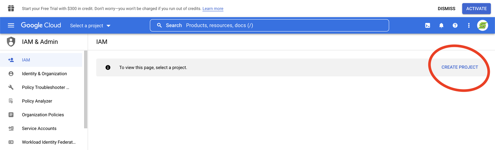 Tại Menu bar > IAM & Admin > Service Accounts > CREATE PROJECT.