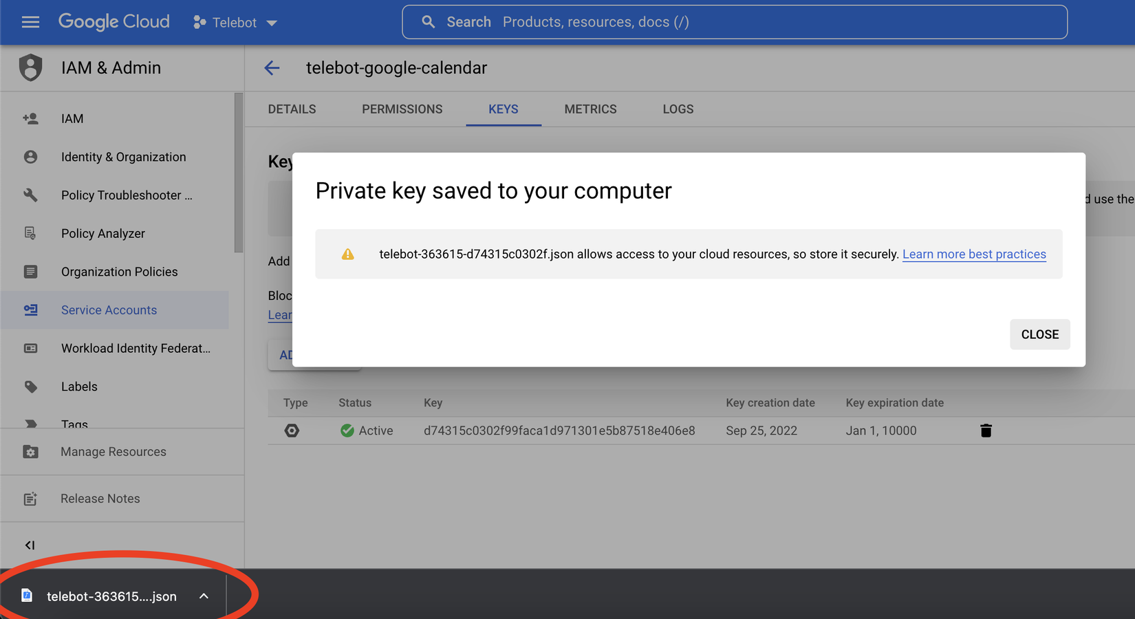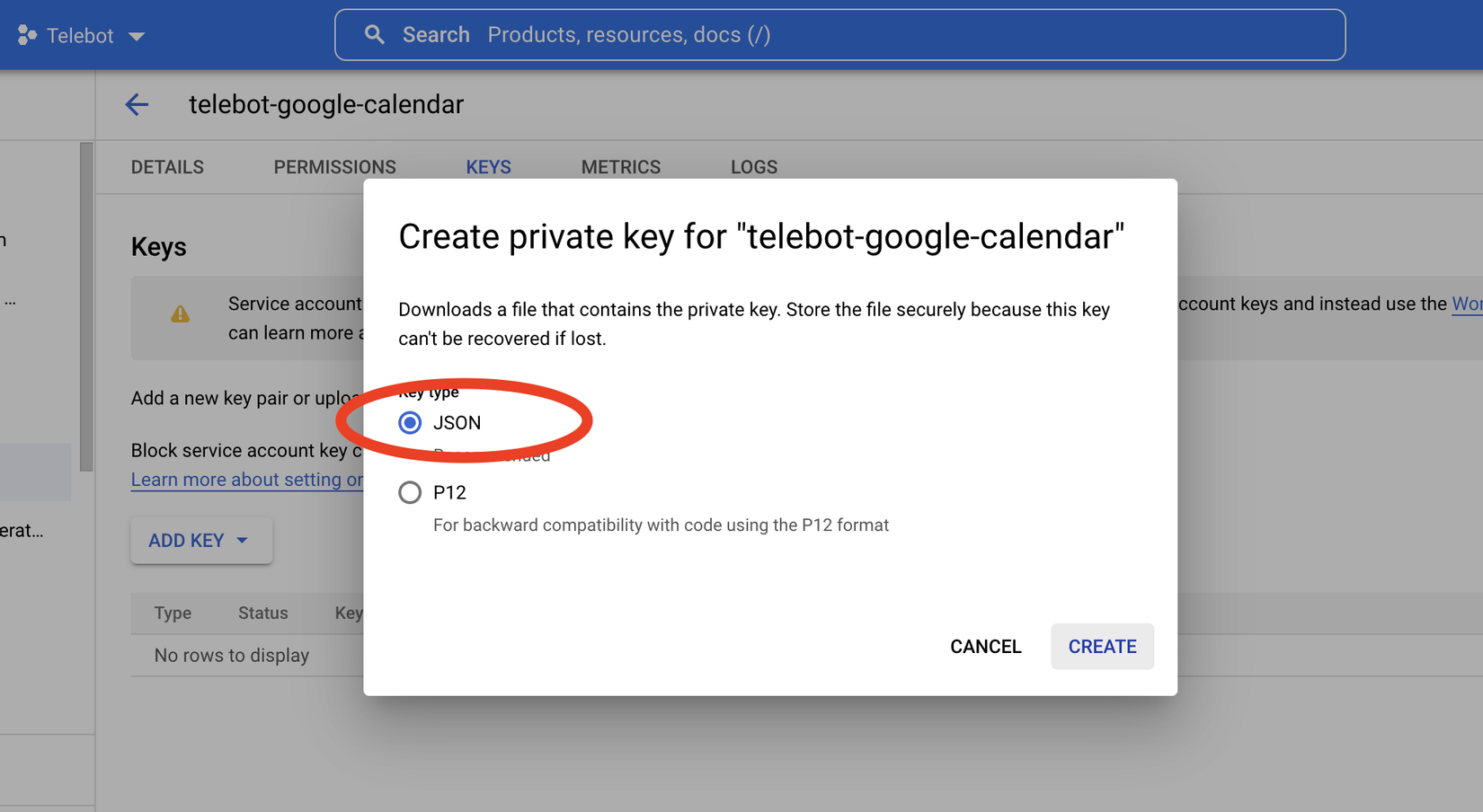 Ở đây mình sẽ chọn private key dạng JSON và nhấn CREATE.
