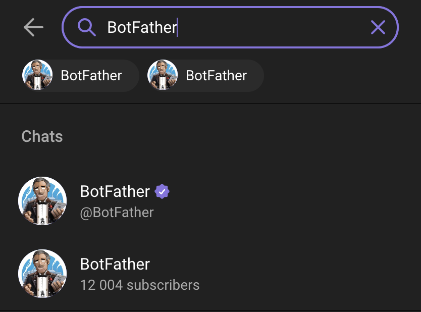 Sau khi đăng nhập telegram các bạn vào thanh search để tìm chúa tể của những con BOT được gọi là "BotFather" (các bạn nhớ chọn con có tick xanh nhé).