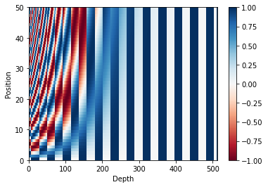 Khi giá trị i càng deep, càng lớn thì giá trị hàm sin và cos tiến đến 0 và 1nên các vị trí embedding sẽ gần giống nhau. Do đó càng về sau, các cột màu đều một màu, không có sự khác nhau lớn.